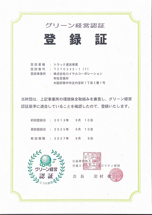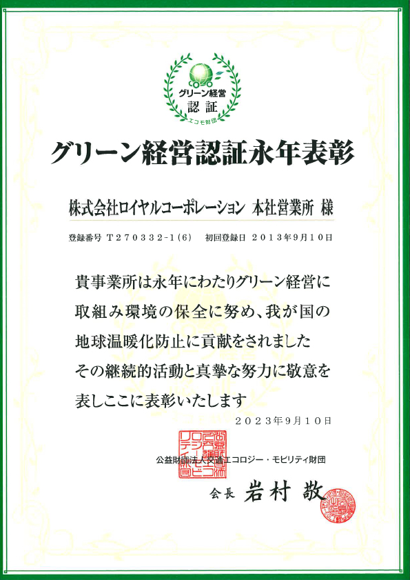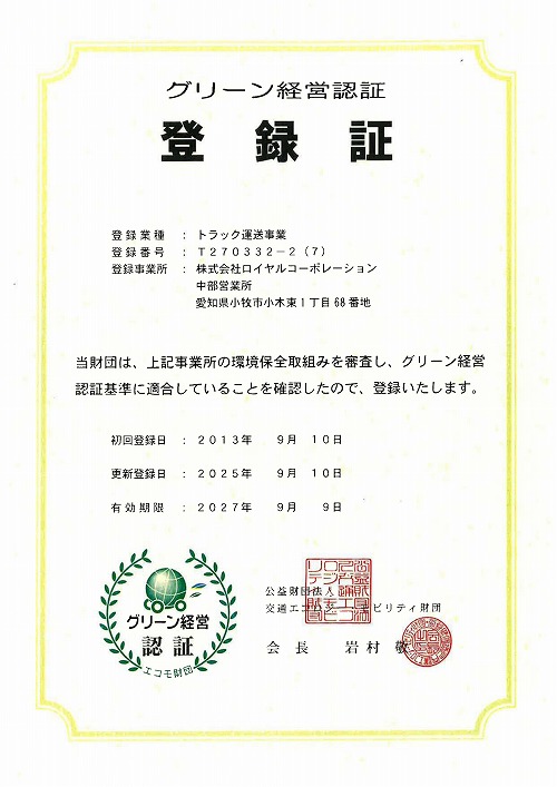 このたび、当社(本社営業所・中部営業所)はグリーン経営認証の6回目の更新審査を無事に終え、認証を継続することができました。 12年間にわたり、環境に配慮した経営を続けてきたことは、私たちの誇りです。燃費目標など課題もありますが、日々の積み重ねが確かな成果につながっています。 これからも、持続可能な社会の実現に向けて、地道に、そして着実に取り組んでまいります。