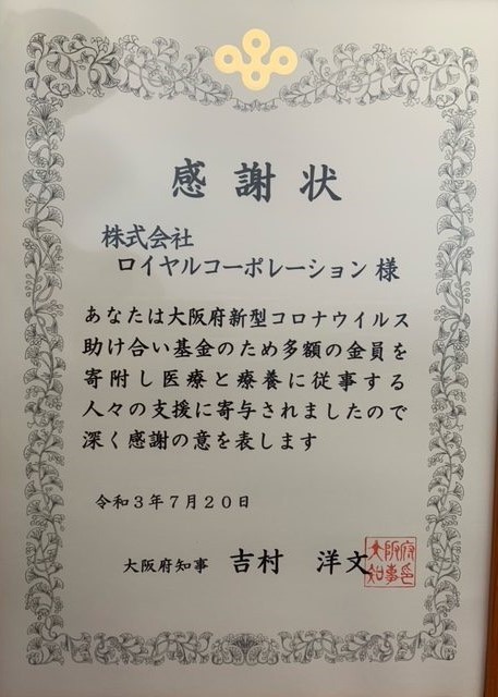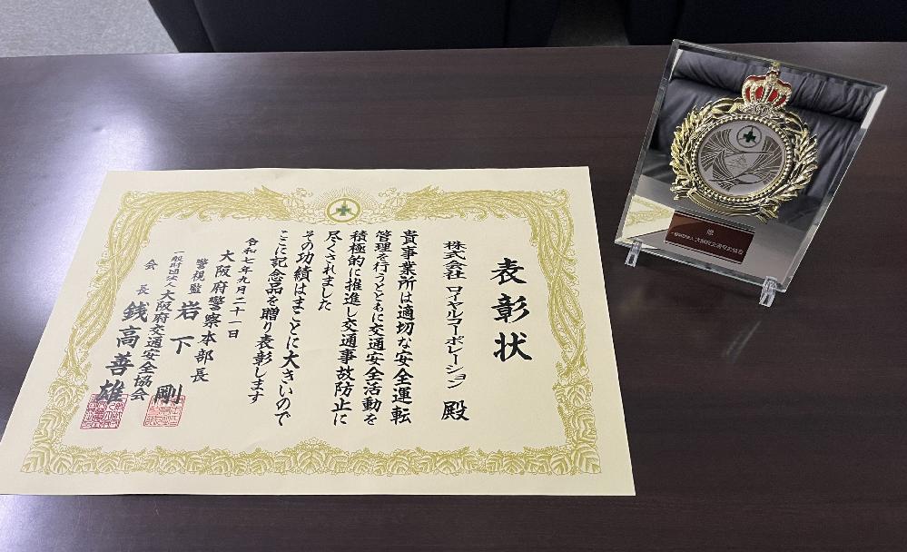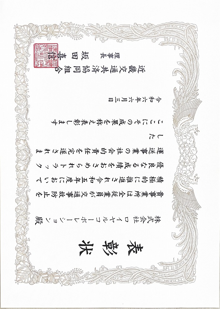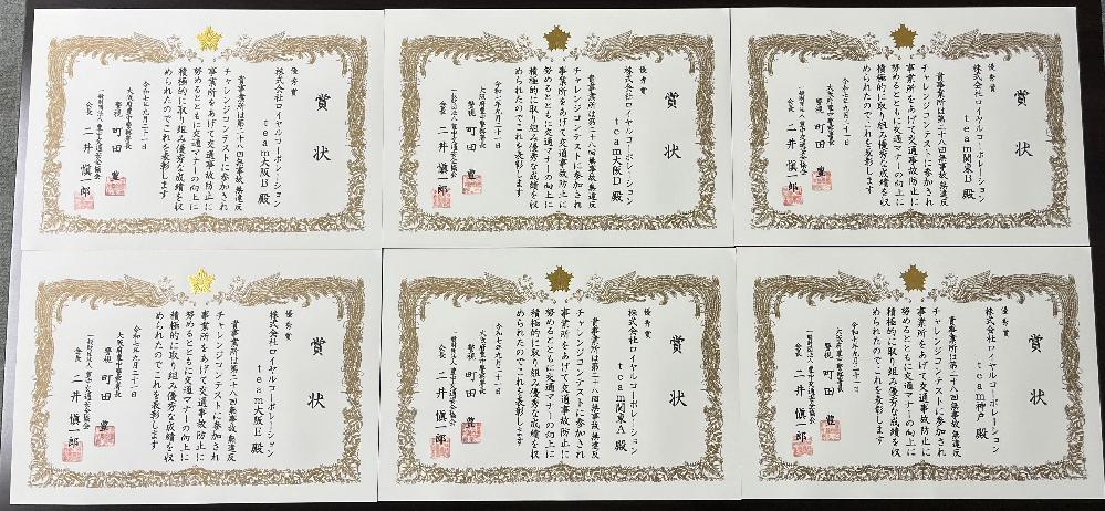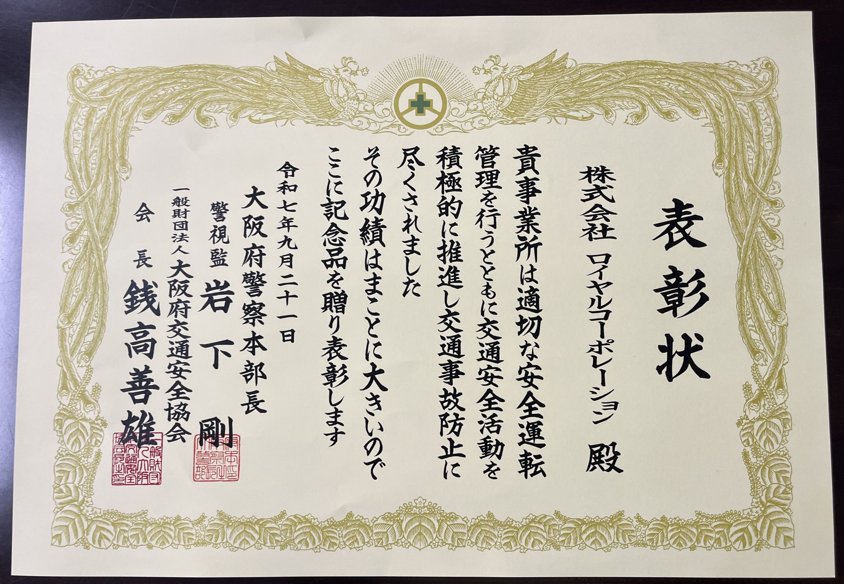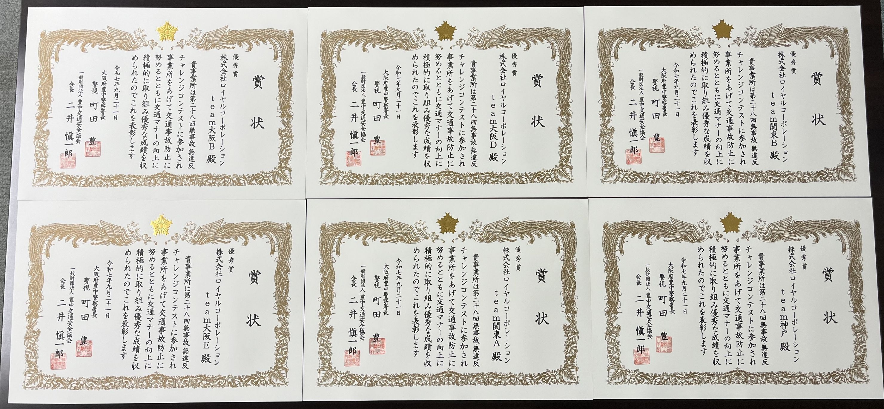 活動による優良な成績をおさめたとの内容で、表彰状を頂きました。 ロイヤルコーポレーションでは、交通事故事故防止の取り組みを継続していきます。