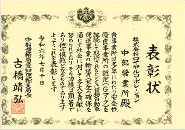 愛知運輸支局長表彰 | 適正化事業実施機関 | 一般社団法人 愛知県トラック協会参照 今後も、ロイヤルコーポレーションでは、引き続き安全への取り組みを継続させていただきます。