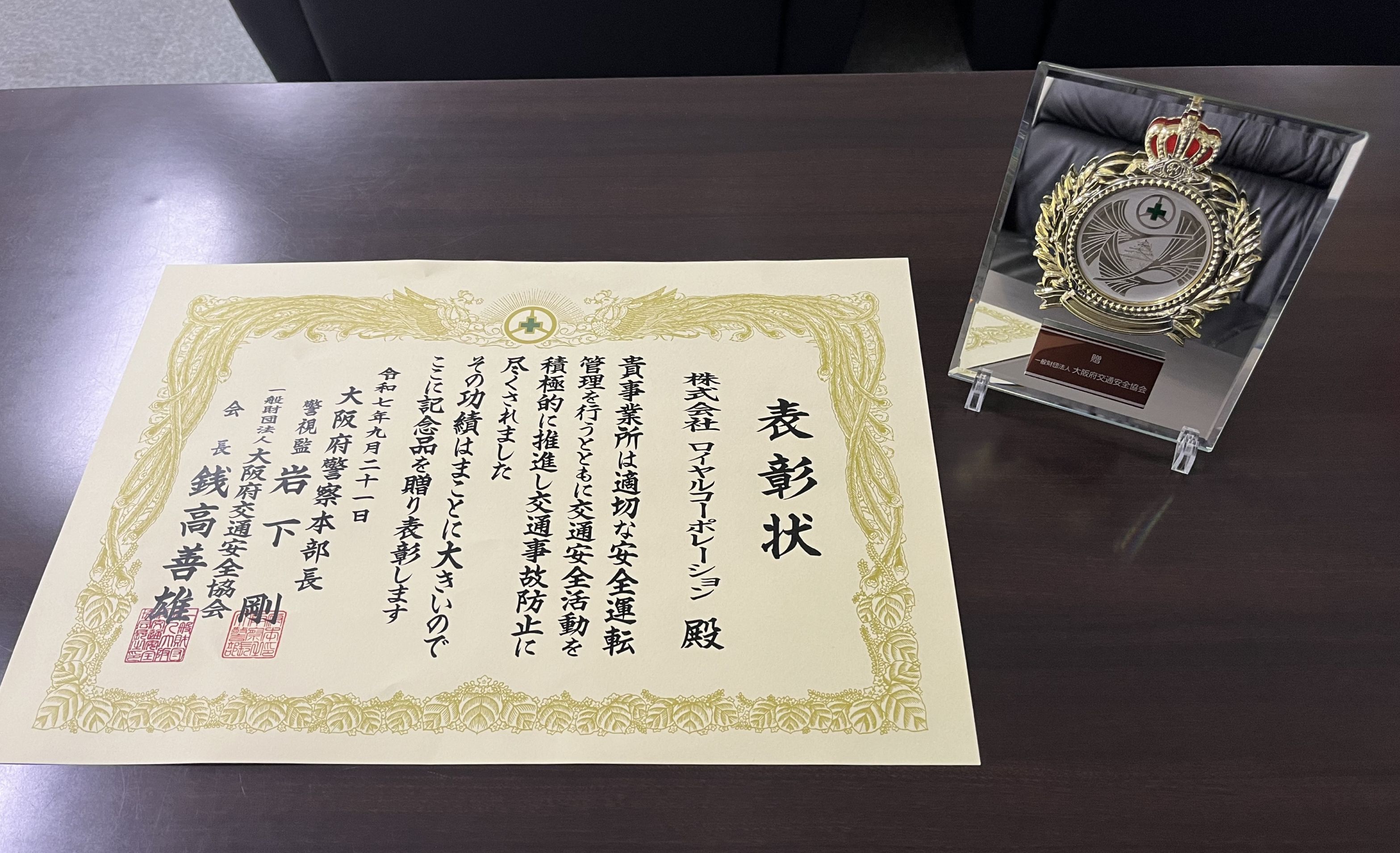 この度、当社は交通安全功労者として表彰を受けました。 長年にわたり、交通安全の啓発活動や安全運転の推進に取り組んできた姿勢が評価され、今回の受賞となりました。今後も地域社会の安全に貢献できるよう、社員一同、交通安全意識の向上に努めてまいります。