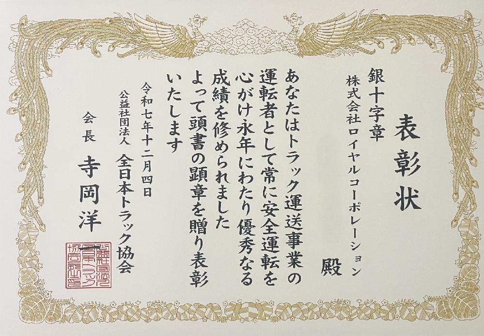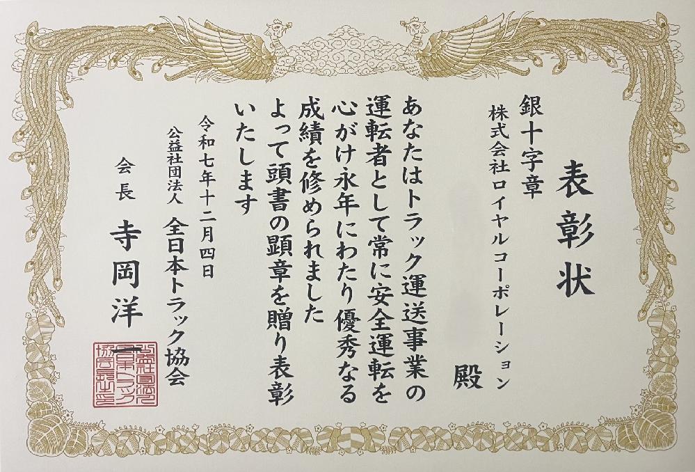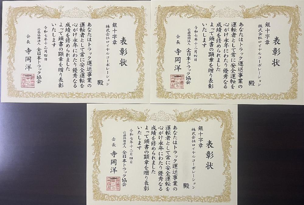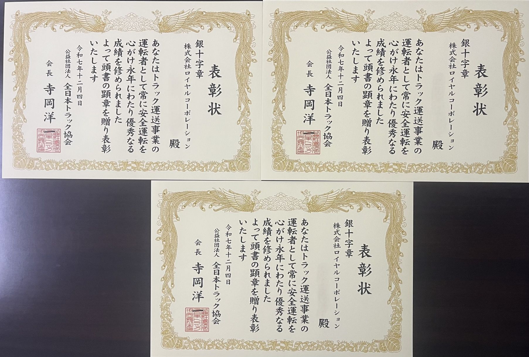 このたび、当社のドライバー計7名が、長年にわたる無事故・無違反の功績により、公益社団法人全日本トラック協会より「自動車運転顕章」を受章いたしました。