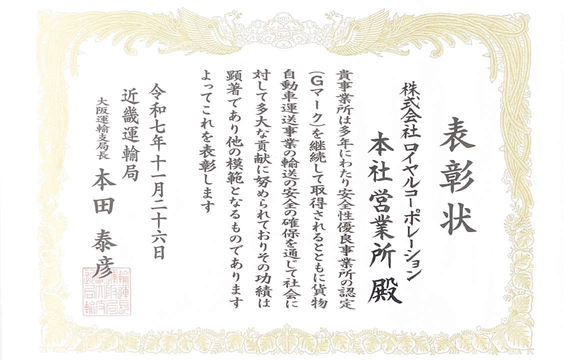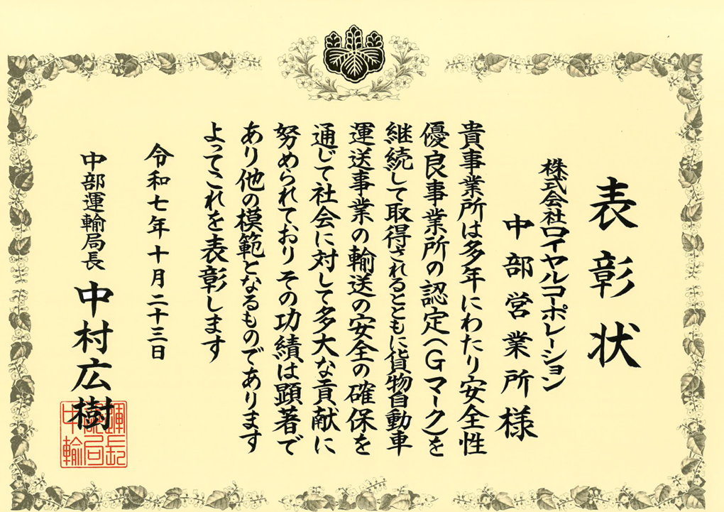 このたび当社は、令和7年度「安全性優良事業所(Gマーク)」大阪運輸支局長表彰、愛知県運輸支局長表彰を受賞致しました。